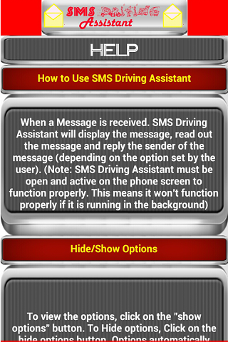 SMS Driving Assistant Helps you to handle your SMS whenever you are driving. When messages are received, SMS Driving Assistant reads out the message, Auto replies the sender with a message set by the User or the default message. Features - Reads Messages Out (Optional) - Displays message on screen - Custom reply response - Notify list (send to only some numbers set by the User) - Play sound when message is received from numbers on Notify List