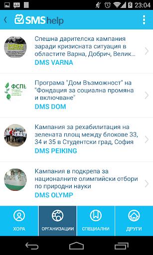 Приложението обединява всички дарителски SMS кампании, налични в страната ни, а именно: