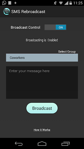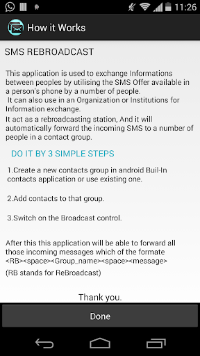 This app will forward an incoming SMS to a contact group. This enables you to turn your phone into a powerful SMS re-broadcast station. Now you can share an SMS plan with a group of friends or family. Organizations can use this application to setup bulk-SMS distribution systems.