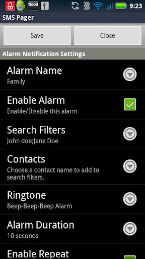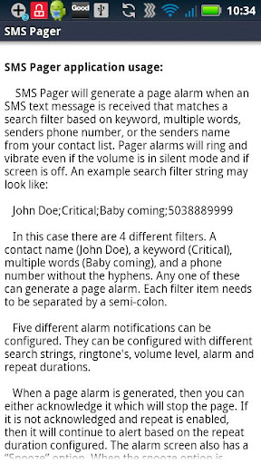 SMS (Text) Pager will generate a page alarm when an SMS text message is received that matches a search filter based on keyword, multiple words, senders phone number, or the senders name from your contact list. Pager alarms will ring and vibrate even if the volume is in silent mode and if the screen is off. An example search filter string may look like: