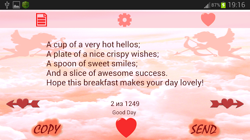 Any SMS you like can be added to your favorites, copied to the clipboard, send by text message, shared on Facebook and other social networks (or any installed application that accepts text)