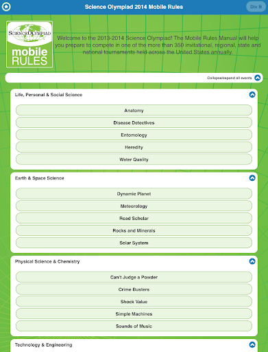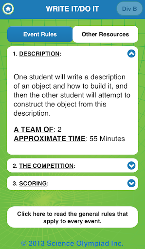 • Links to all the most popular sections of the Science Olympiad website let you travel in and out of the app to check Policies, FAQs, Rules Clarifications, General Rules and more