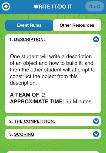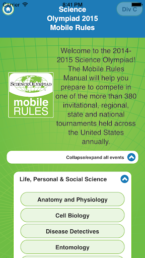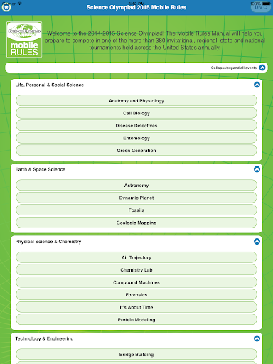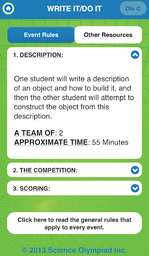 • Links to all the most popular sections of the Science Olympiad website let you travel in and out of the app to check Policies, FAQs, Rules Clarifications, General Rules and more