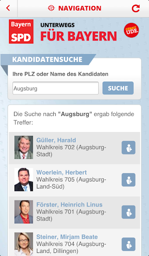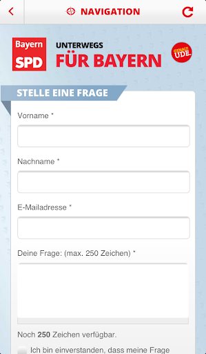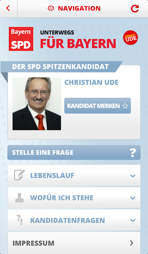 App der SPD Bayern zur kommenden Landtagswahl 2013 mit Informationen zu allen 90 Direktkandidaten und dem Spitzenkandidaten Christian Ude, Dialogoptionen, Terminübersichten, Vernetzungsoptionen und direkte Mitteilungen von aktiven Kandidaten via Push Notification. Allgemeiner Hinweis: Die Applikation kann nur mit bestehender Internetverbindung genutzt werden.