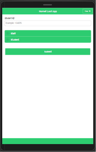 The Hornet Loot App was designed to be used by both staff members and students alike. Staff members are able to take attendance at events and award points to the attending students. The attending students can then log into the app with there student ID number and instantly view their running point score. The students can also see a top ten list of high scores.