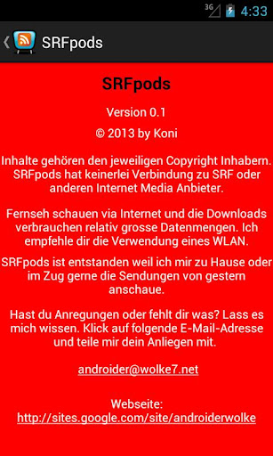 Mit dieser gratis App kannst du alle - also mehr als 50 - Video Podcasts des Schweizer Fernsehen SRF anschauen und auf Wunsch auch herunterladen. Schau dir einfach die letzten Folgen deiner Lieblings-Sendung nochmals an. Der Download mit der App geht ab Android 2.3. Drücke einfach lange auf die gewünschte Sendung und wähle zwischen "Download" und "Stream".