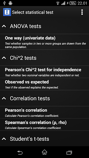 - Correlation tests: Pearson's correlation and Spearman's correlation