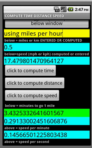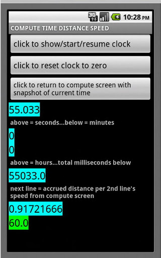 USE STOPWATCH TIMES TO COMPUTE EITHER SPEED OR DISTANCE. 2 SCREENS...STOPWATCH SCREEN AND A COMPUTE SPEED, DISTANCE, TIME SCREEN WHEREIN THE TIME CAN COME FROM THE STOPWATCH OR CAN BE ENTERED SEPARATELY. HANDY FOR TIMING TRACK EVENTS - CARS, HORSES, TRACK AND FIELD, ETC.