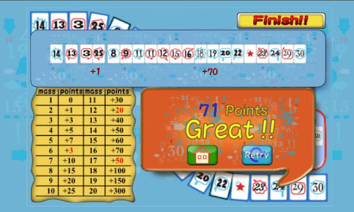 The goal is to place cards on 20 squares (colored in light blue) lined like a river stream in the order that the number gradually