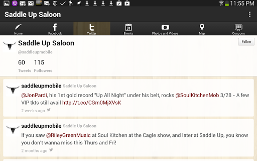 This is an app for customers and potential customers of Saddle Up Saloon in Mobile, Alabama to get the latest information on Concerts, Events, Specials and Coupons.