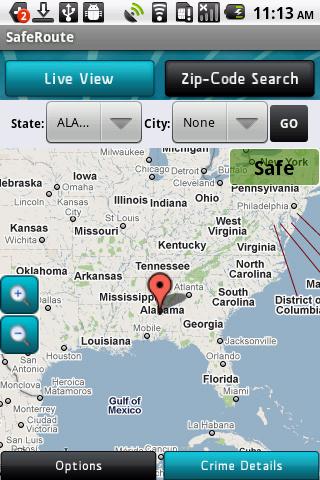 SafeRoute is an Android based mobile application that provides GPS enabled crime statistics and safety levels for every city in the entire United States where enough crime data to report is present. The application even takes it a step further to provide safety levels (safe, moderate, dangerous) for every zip code in select major cities. No matter where you are in the United States, as long as your Android device is GPS enabled, SafeRoute will detect exactly where you are and tell you if the area is safe, moderate, or dangerous. You then just press "Crime Details" and you will see the detailed crime stats for that city which has come directly from the FBI statistics. Want to see what other SafeRoute users are saying about a particular US city?? Just press "Comments" and you can see what others are saying or you can even leave a comment yourself. You can also learn crime statistics and safety level by touching the area on the map, using city/state drop down box, or typing in the zip code.