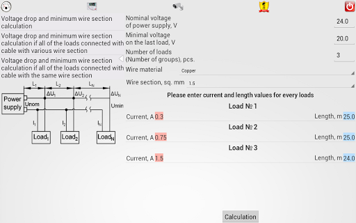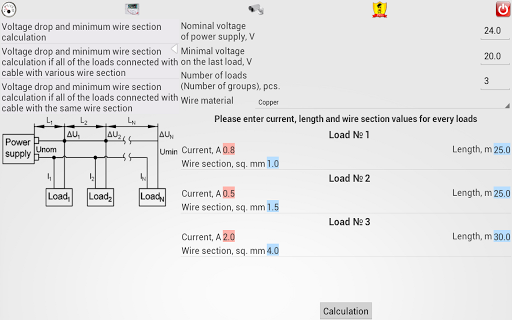 - Calculation of the voltage drop in a branched electric circuit with many loads for each load, and to determine the minimum cabel wire section;