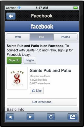 Saints Pub + Patio offers good food, great service and a vibrant atmosphere. Saints has two locations in the Kansas City metro and two locations in the Des Moines metro. Each location offers numerous flat screen televisions with expansive sports programming. Each location also has an outdoor patio. Saints takes great pride in the quality of its food with many made from scratch items on the menu. The Saints Pub and Patio App allows patrons to review our menu, uncover App only specials and request our shuttle services to all of our locations.