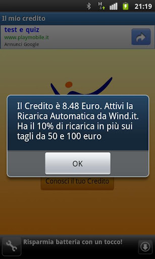 Applicazione che permette di visualizzare il proprio credito telefonico WIND senza dover digitare il codice sulla tastiera del telefono e senza SMS, direttamente sullo schermo del vostro telefono. Esiste la versione Widget da me creata e si chiama "Credito Wind".