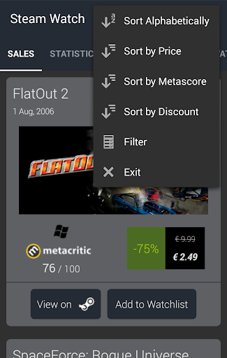 Sales Watch is an app designed to help you find Steam offers easier and further explore Steam. It's an easy to use application developed for Steam gamers. Its features include: