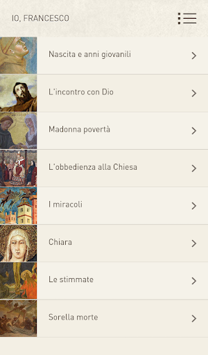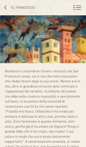 Tutti i contenuti provengono dalle Fonti Francescane e dalle pubblicazioni della casa editrice Porziuncola di Assisi: scritti e preghiere come pensieri ispiratori e alimenti quotidiani per la fede e la speranza, centinaia di immagini sacre di Francesco, dei luoghi in cui ha vissuto, dei miracoli, dei momenti mistici della sua vita.