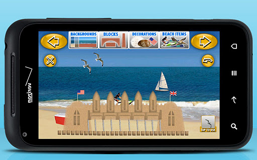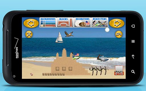 Choose a background, and then start building as tall and as big as you want with a variety of shapes and sizes of sand blocks! Top off your cool castle with flags, umbrellas and other “beachy” items! Add surfers and other ocean scenery to your background! The array of choices will create a huge variety, so you will never build the same castle twice!