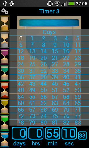 Operate up to 8 sand timers simultaneously (each one is colored differently and selected at left of screen).