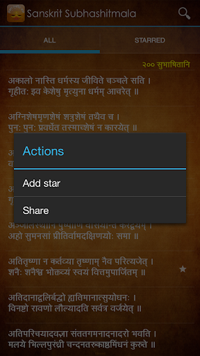 3. Ability to add Subhashitas [सुभाषितम्] as favorite or share with different applications using context menu.