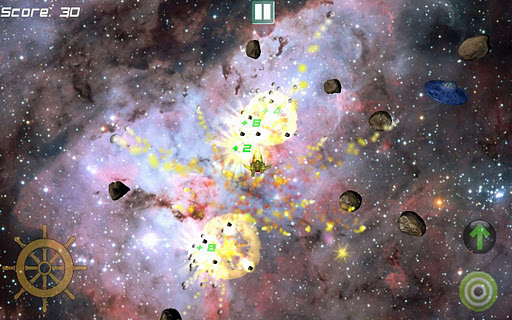 There is also a "Classic" game mode: Play a classic Asteroids-style game. You have no shield but an Hyperspace button to escape difficult situations (but where you will respawn, it could be worst). Each asteroid you hit will be divided into 2 smaller asteroids. The smaller it is, the more points you will be awarded.