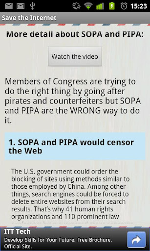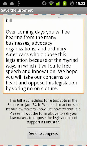 There are currently two bills before Congress, known as the Protect IP Act (PIPA) in the Senate and the Stop Online Piracy Act (SOPA) in the House. These bills would censor the Web and impose harmful regulations on American business. Millions of Internet users and entrepreneurs already oppose SOPA and PIPA. Press the button at the bottom of this page to send a message to your local congress, urging them to vote against these bills.