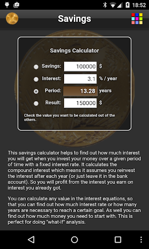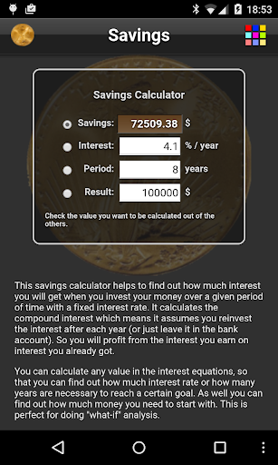 This savings calculator helps to find out how much interest you will get when you invest your money over a given period of time with a fixed interest rate. It calculates the compound interest which means it assumes you reinvest the interest after each year (or just leave it in the bank account). So you will profit from the interest you earn on interest you already got.