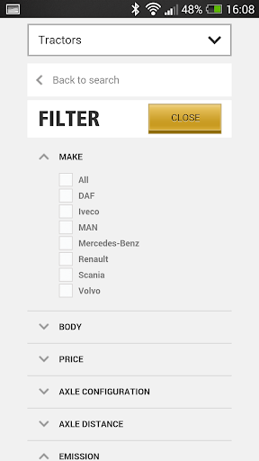 Search and compare Tractors, Rigids, Buses, Coaches or Trailers. All makes and models can be found using our simple filters covering Make, Body, Price, Axle Configuration, Axle Distance, Emissions, Cab Type, Engine Power, Mileage, Gearbox, Max Weight, Year (Range), Country, Equipment or Used Vehicle Center.