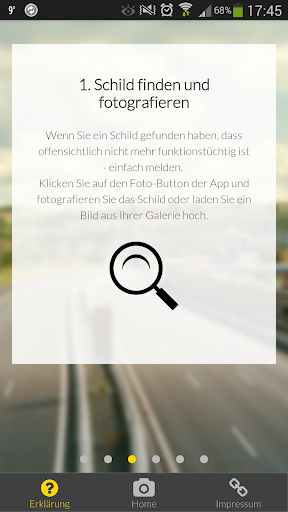 Diese APP dient der fotografischen Erfassung und groben Prüfung von Verkehrszeichen aller Art. Ziel der App ist die Dokumentation schlechter Verkehrszeichen, die die Verkehrssicherheit gefährden und deshalb ausgetauscht werden sollten. Mit jedem gemeldeten Schild leisten Sie also Ihren Beitrag zu mehr Sicherheit auf Deutschlands Straßen.