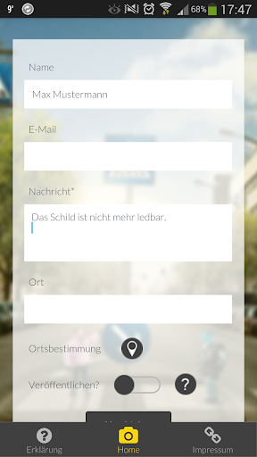 Mit dieser App können Sie Schilder fotografieren oder bereits fotografierte Verkehrszeichen aus Ihrer Galerie in die App laden. Anschließend können Sie das Schild beim Schilderüberwachungsverein e.V. melden, in dem Sie das Schild über die App auf unseren Server laden. Ihre Daten werden von uns nicht benutzt, die angegebenen Daten dienen ausschließlich der Vermeidung von Missbrauch. Die hochgeladenen Bilder werden nur mit Genehmigung des Benutzers für die Kommunikation des Schilderüberwachungsvereins e.V. benutzt.