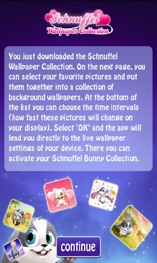 This app helps you select your favorite Schnuffel Bunny images and set them as a slideshow background on your display. Choose the most beautiful pictures and set the time interval for each image at the bottom. Confirm your selection and the app will send you to your device’s live wallpaper settings where you can activate your special Schnuffel Bunny background.