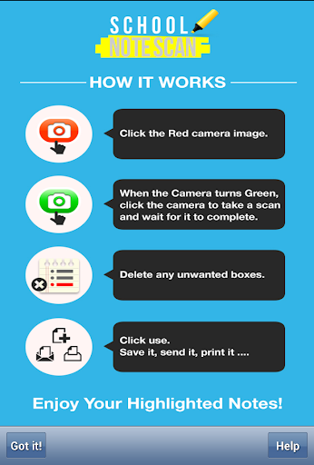 The School NoteScan App supports students to capture any highlighted text in paper notes, and store it to your Android Device. Create amazing notes by scanning what was highlighted by you and then read them in bullet point format. You can then save and share these notes across devices and on the cloud.