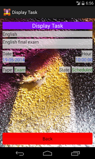This application allows you to create all kinds of school assignments (exams, tests, work, study, etc.). Each of them can associate an alarm to remind you at the appropriate time of the existence of this task.