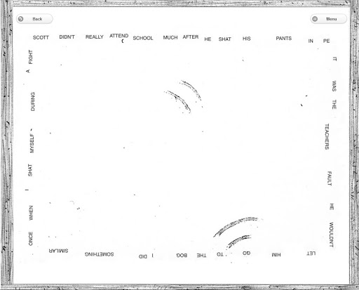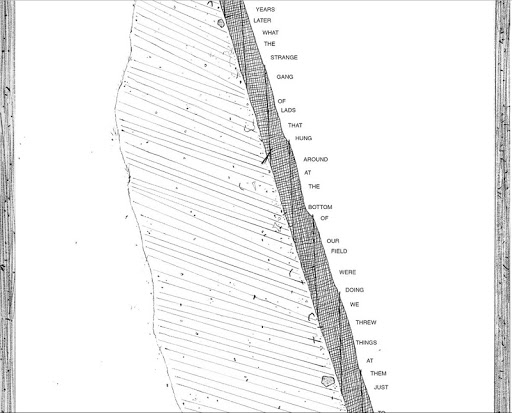 It’s a drawing from memory of my old secondary school in Wythenshawe, that had been knocked down in 2001. The piece is an intimate portrayal of incidents and events that went, around and about the school environments during playtime, in fact the length of the piece is 15 minutes long, the length of playtime, at which time the soundtrack ends and the CD pops out ready for the next viewer or participant to play. I saw the piece as a kind of alternative friends re-united in that I’m presenting the kind of anecdotal details that people may share on this kind of site about their former classmates.