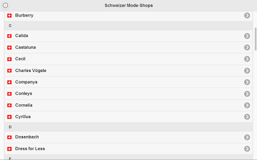 Die App "Schweizer Mode-Shops" bietet Ihnen eine grosse Auswahl an Mode-Shops speziell für die Schweiz. Die App ist sehr einfach gehalten, und lässt sich intuitiv bedienen.