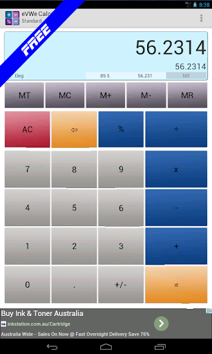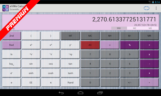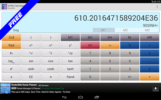 This is the coolest Scientific Calculator available on Android! Over 25 mathematical functions, 3 memory fields fully visible, history, different skins.