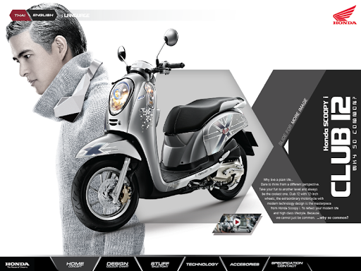 Honda Scoopy i CLUB12 แอพลิเคชั่นสำหรับคนที่ชอบความไม่ธรรมดา กล้าลองในมุมต่าง คิดสนุกไปอีกขั้น เท่ล้ำกว่าคนอื่นเสมอ ด้วยล้อ12 นิ้วซีรีย์ไม่ธรรมดา ดีไซน์ Modern-Technology ระดับมาสเตอร์พีซ สะท้อนชีวิตระดับท็อป บ่งบอกไลฟ์สไตล์ที่เหนือชั้นกว่า แล้วคุณจะต้องถามตัวเองว่า... ทุกวันนี้จะธรรมดาไปทำไม?