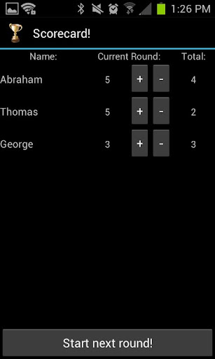 A simple, straight-forward scorekeeper app. The Scorecard! manages running score totals from round to round, for one to ten players. Originally created to help me with disc golf, this app is general enough to work for any sort of game that requires score tracking.