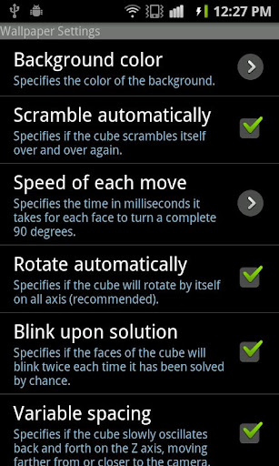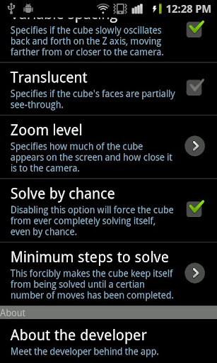 This is a live wallpaper featuring a Rubik's cube self scrambling itself on your home screen! It comes with many different options and settings to play around with. The animations are smooth, the background colors are changeable, the scrambling speed, zoom level, transparency, and a bunch of other stuff can also be tweaked to your liking! You can even make it stop scrambling and just rotate in it's solved state on your home screen. A great wallpaper for puzzle lovers, geeks, or anyone else!