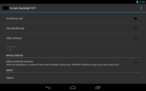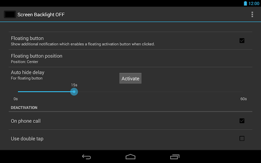 ● Shortcut (allows other apps, e.g., automation tools, to switch off the backlight via this app)
