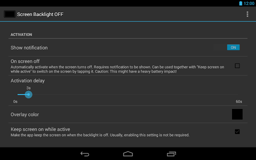Most video players stop playback when the screen is turned off. This app switches only the screen backlight off but not the complete screen. Save battery and enjoy playback without the backlight staying on!