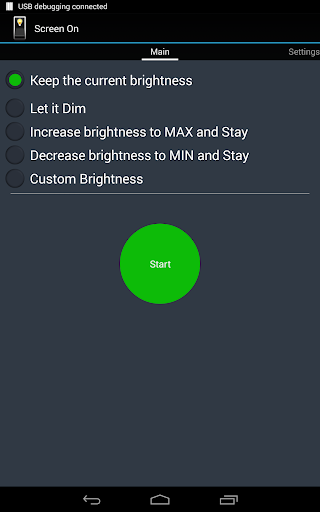 Screen on allows you to keep the screen ON with five options to adjust the brightness preventing the screen to lock and to keep the screen awake .