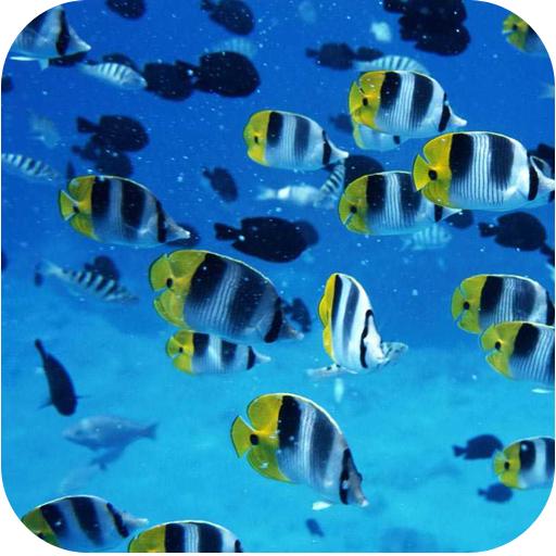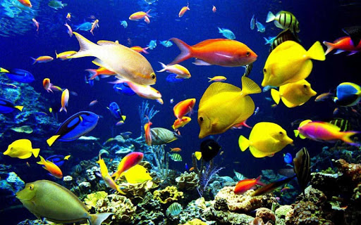 Tropical fish swim around in the water.