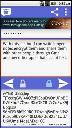 With the image encryption you can open or capture an image file with Secret Text and encrypt it as you would with text. Once it's encrypted you can save it to your device, email it with Gmail or share it with other apps like Dropbox to share it with other people. Once the file is encrypted it cannot be changed/scaled or it will not be able to be decrypted.