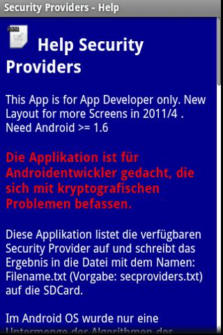 Listet die Algorithmen des Security Provider des Android Gerätes auf und schreibt diese in eine Datei. Siehe Help der Applikation. Die App sollten Developer und User mit Security-Datenschutz Bedarf nutzen!
