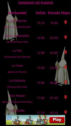 Calendario y Horarios de todas las hermandades de Sevilla en sus estaciones de penitencia durante la semana santa de 2015 incluyendo accesos directos a google Maps de la ubicación de las sedes de donde salen y entran los diferentes pasos. Así como información meteorológica.