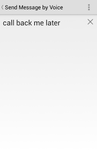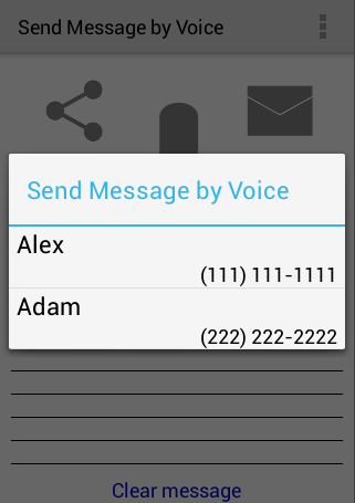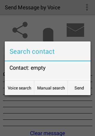 Send Message by Voice application provides you easy in use system to write messages by voice. You can change message use voice or keyboard. You can send message as SMS or share your message. You can save message on your device and send or share it later. Integration with other application. You must have installed the "Google Voice Search".