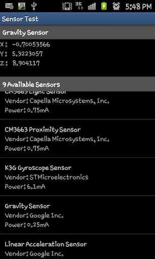 On selecting from the list, the application displays the current raw values returned from the sensors.