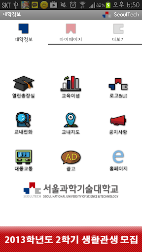 SeoulTech 모바일은 전세계 어디서나 안드로이드폰 사용자들이 무료로 서울과학기술대학교에 대한 정보를 받을 수 있는 서비스입니다. 다운로드와 동시에 로그인 없이 어플리케이션만 있으면 실시간으로 공지사항, 대중교통, 지도 등의 정보를 간편하게 받을 수 있습니다. 간단한 학사정보 로그인을 통하여 자신의 시간표를 확인하고, 도서관 도서검색 및 대출내역 확인, 좌석정보 및 연장 알림기능을 이용하실 수 있습니다. 또한, 교내 WiFi 신청 및 확인이 가능합니다.