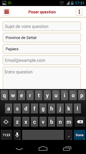 - A la rubrique Poser question, service qui permet à l’usager de consulter la base de données des Questions/Réponses, et de poser directement par téléphone/email des questions spécifiques à « Idarati ».