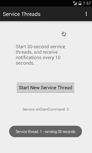 Start threads in a background service. The threads run for 30 seconds and generate notifications on the UI every 10 seconds. The service threads use Eventbus to communicate with an activity.